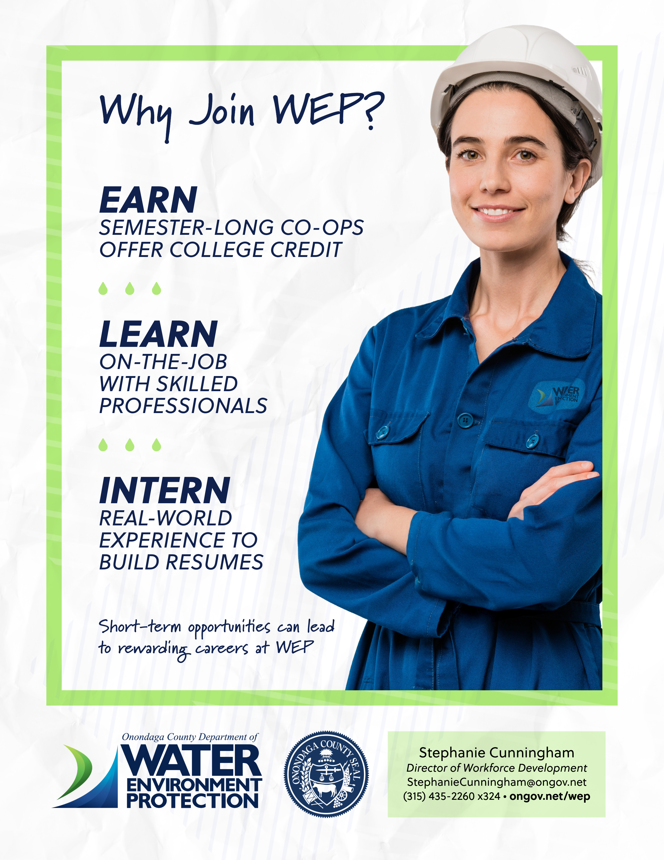 A career with Water Environment Protection means more than just meaningful work — it also means meaningful support. The Onondaga County benefits package is designed to promote health, security, and balance. At WEP, we invest in our people so they can invest in their future.
