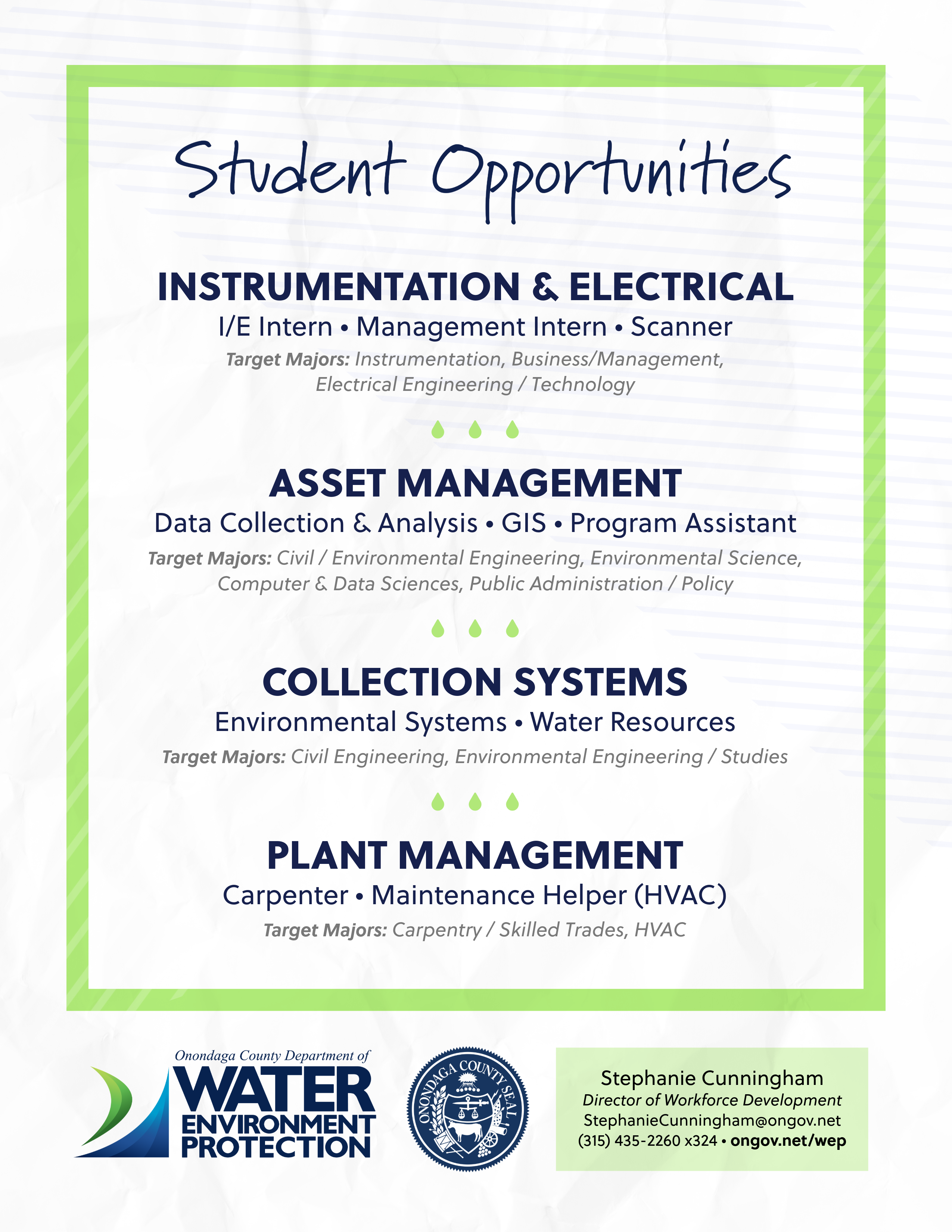 A career with Water Environment Protection means more than just meaningful work — it also means meaningful support. The Onondaga County benefits package is designed to promote health, security, and balance. At WEP, we invest in our people so they can invest in their future.